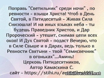 ПОЖЕЛАНИЕ- Да будет Милость Иисуса - в твоих Молитвенных Путях! Да будет Сердце - словно ЗНАМЯ,в Пророческих Живых Дарах!Да не споткнёшься ты пред Богом,-ведь Дух Святой всегда с тобой,дающий в Ревности - Победу, "БОГ ПОМАЗАНИЯ - БОГ ЖИВОЙ!"Аминь!